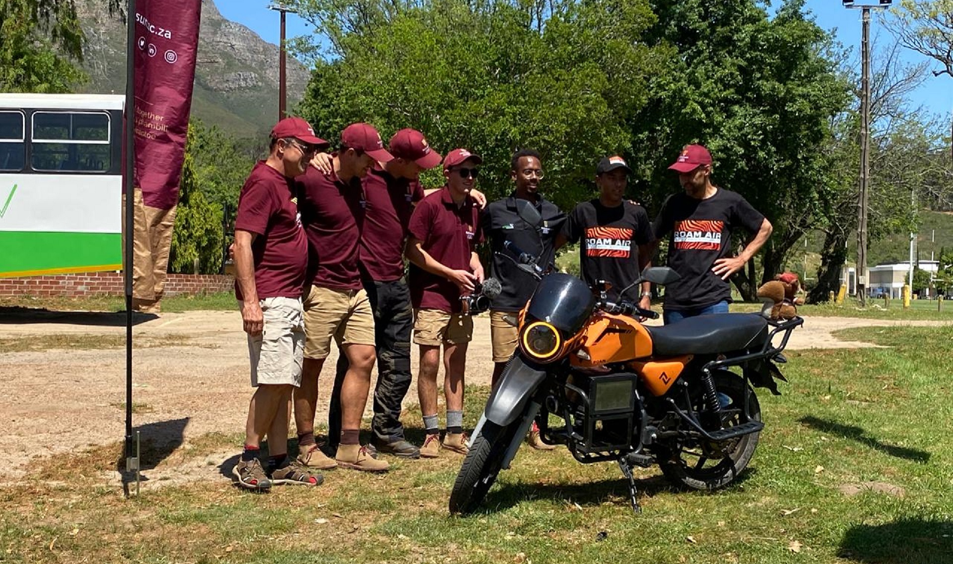 Die groep ingenieurs, wat Woensdagmiddag in Stellenbosch aangekom het, het bewys dat hulle van Kenia na Suid-Afrika kan reis met slegs 'n battery-aangedrewe motorfiets, genaamd die Roam-Air.