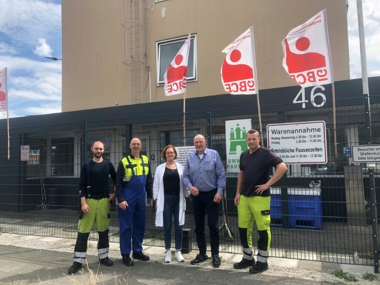 In Hamburg, the flags of the IG BCE trade union are flying in front of the site.