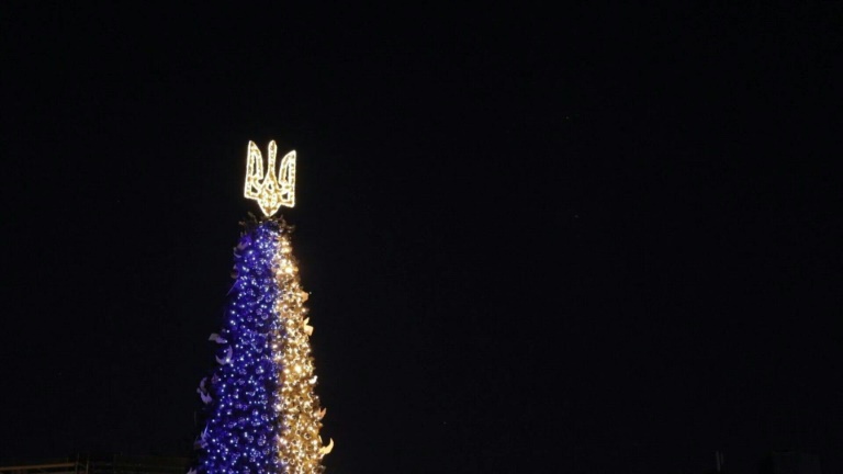 She pointed to the tree illuminated with a constellation of yellow and blue lights, the colours of the Ukrainian flag.