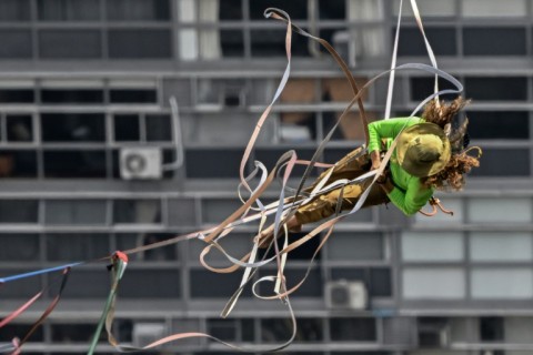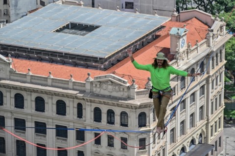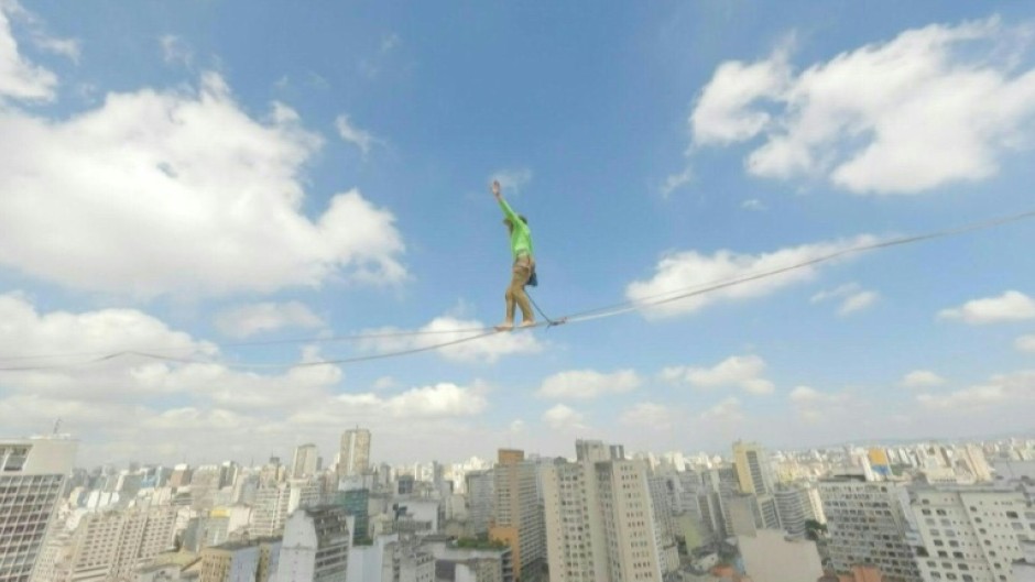 The 35-year-old high-wire specialist walked 510 meters - about a third of a mile - along a slackline strung 114 meters above ground between two tall buildings in the Vale do Anhangabau neighborhood in central Sao Paulo.
