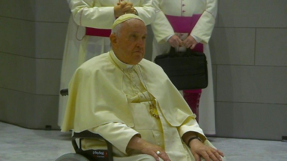 Francis, who uses a wheelchair and walking stick due to knee problems, smiled and waved to the crowds from an open-sided popemobile where he was seated, flanked by more than a dozen suited security guards and attendants.