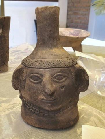 A bundle containing a female character, a black Wari ceremonial vessel, two musical ceramic wind instruments, and two copper fasteners were also found.