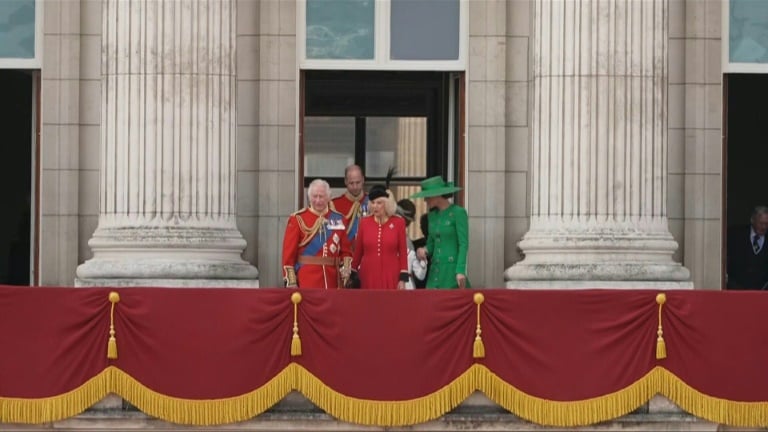 Three of the king's young grandchildren -- future king Prince George, nine, Prince Louis, five, and Princess Charlotte, eight -- joined the rest of the family on the balcony with the princes sporting red ties and blue blazers and Charlotte in a sailor suit with red trim.
