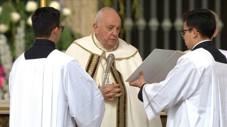 The 87-year-old arrived in a wheelchair to preside over the mass in cloudy and windy weather, with the events broadcast live around the globe.