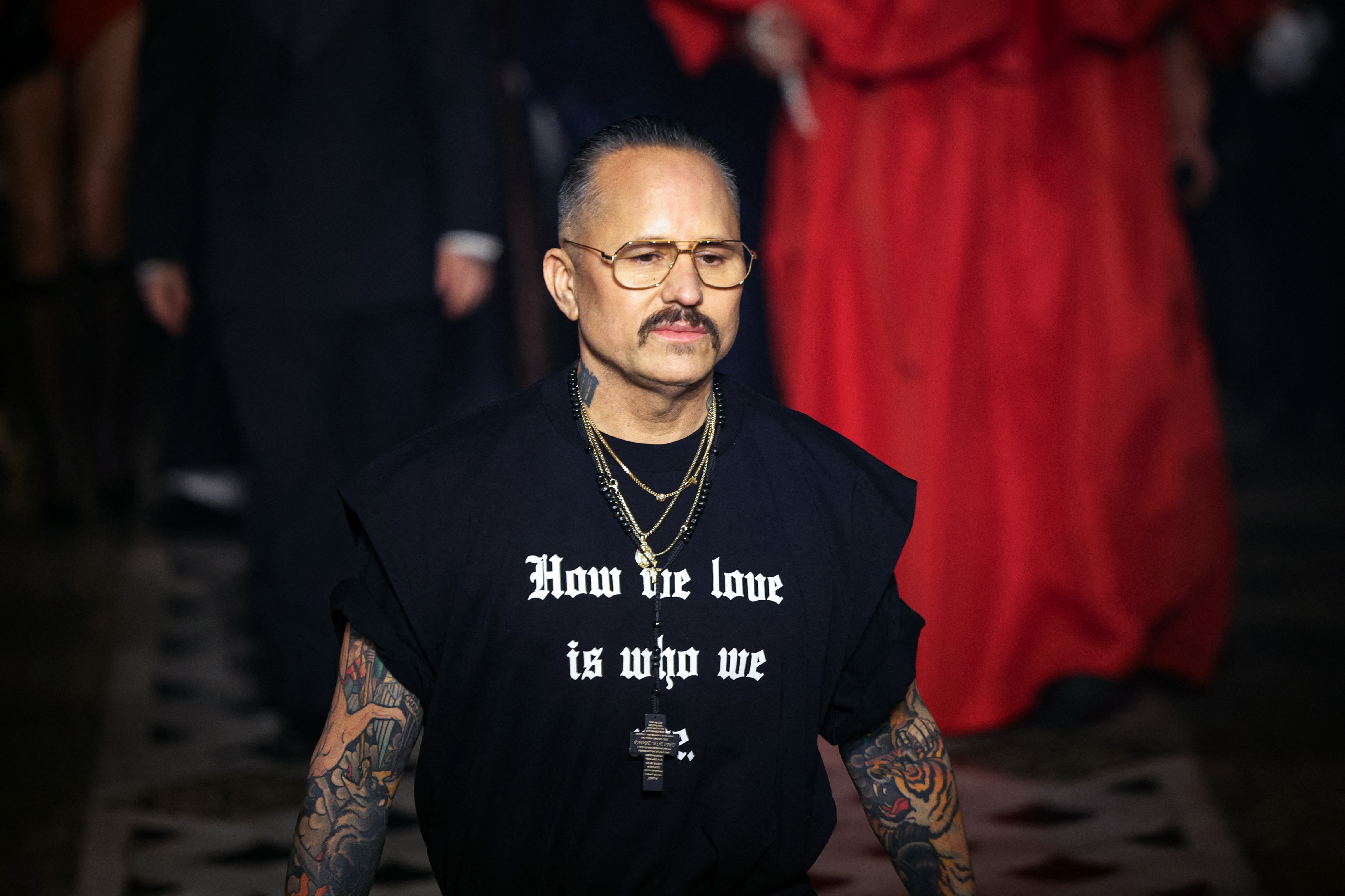 At Mexican American designer Willy Chavarria's show in Paris on Friday, the white T-shirts and shorts worn by his models invoked the uniforms worn by inmates at the Terrorism Confinement Center (CECOT).