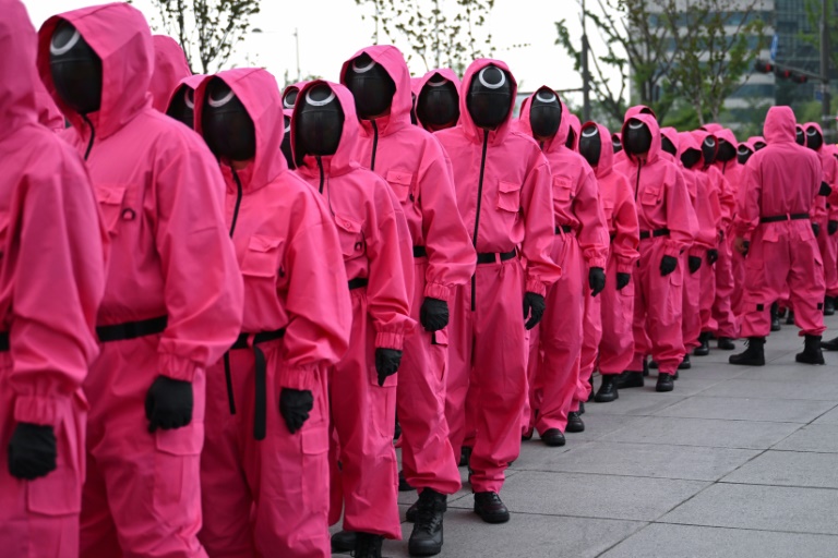 Fans gathered near Seoul's Gyeongbokgung Palace, led by marchers dressed in the bright pink uniforms worn by the show's mysterious masked agents.