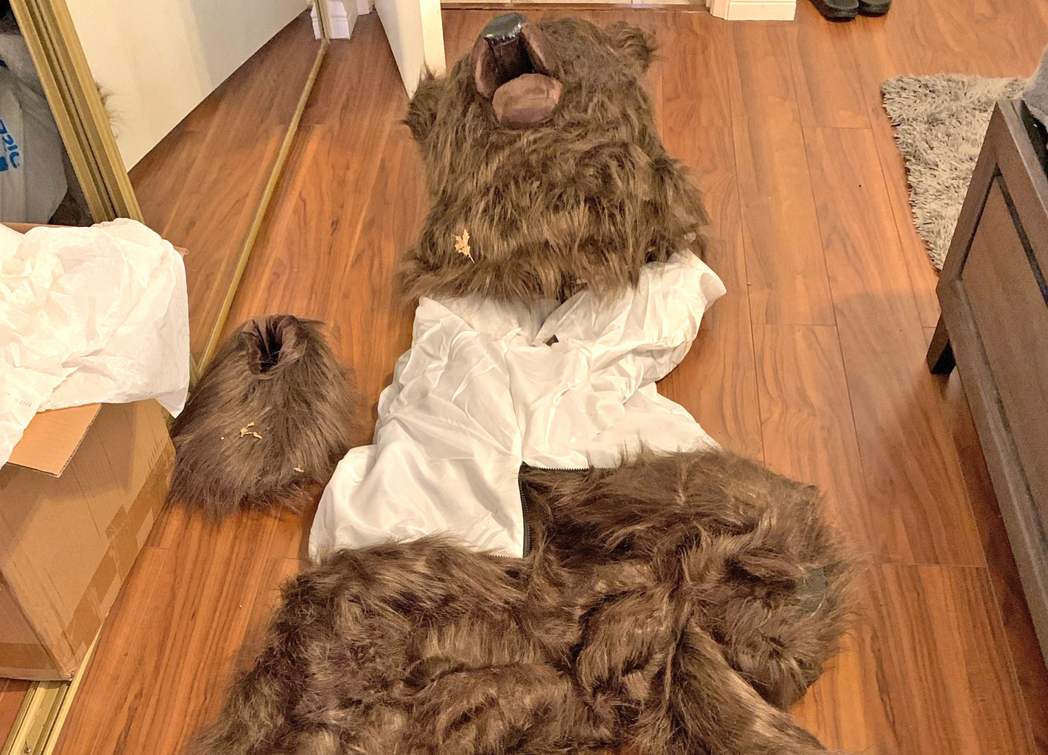 "After executing a search warrant, detectives found the bear costume in the suspects' home."