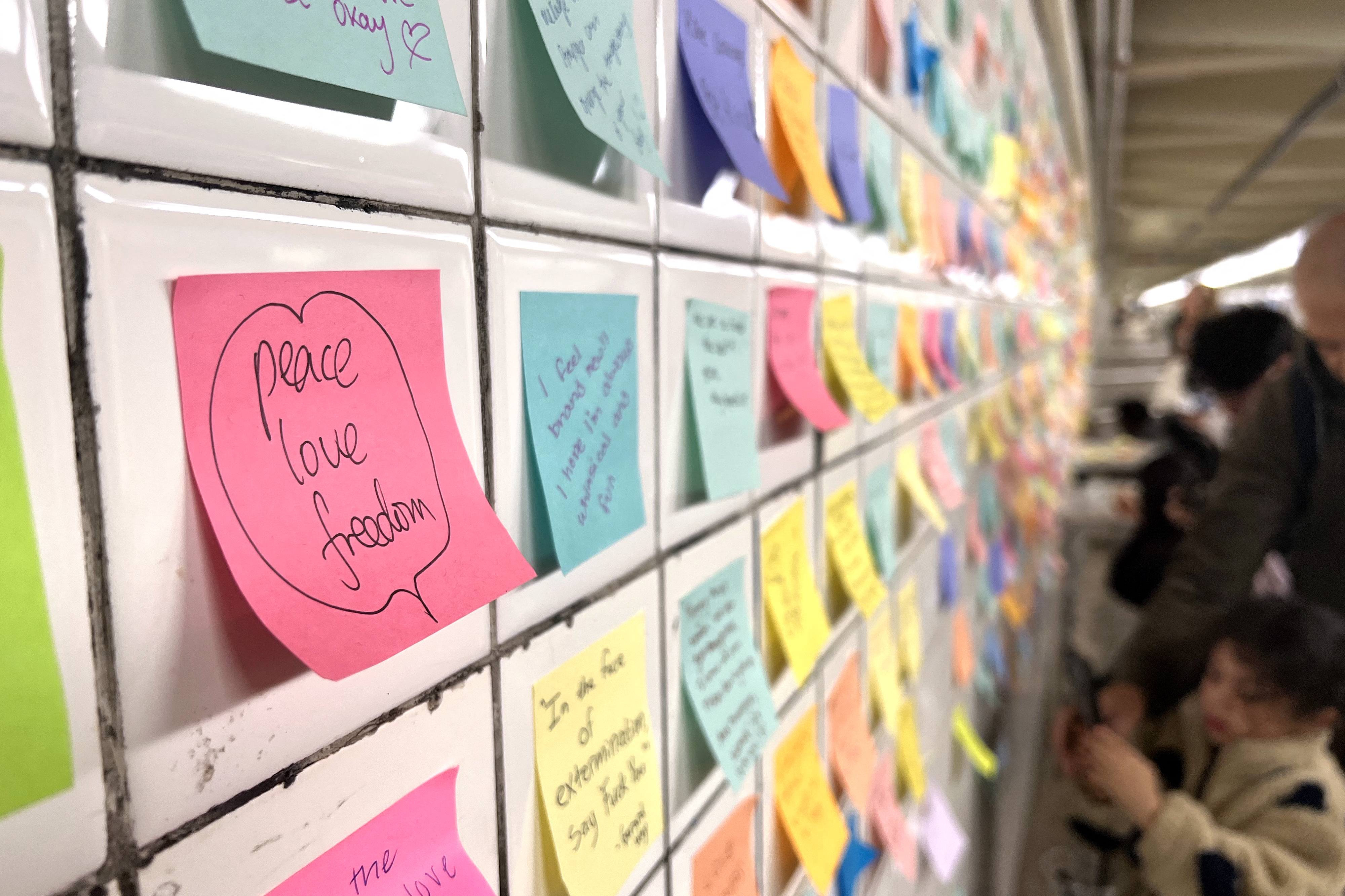 Tourists, business people and parents with infants were among those stopping to read the wall and pen their own notes.