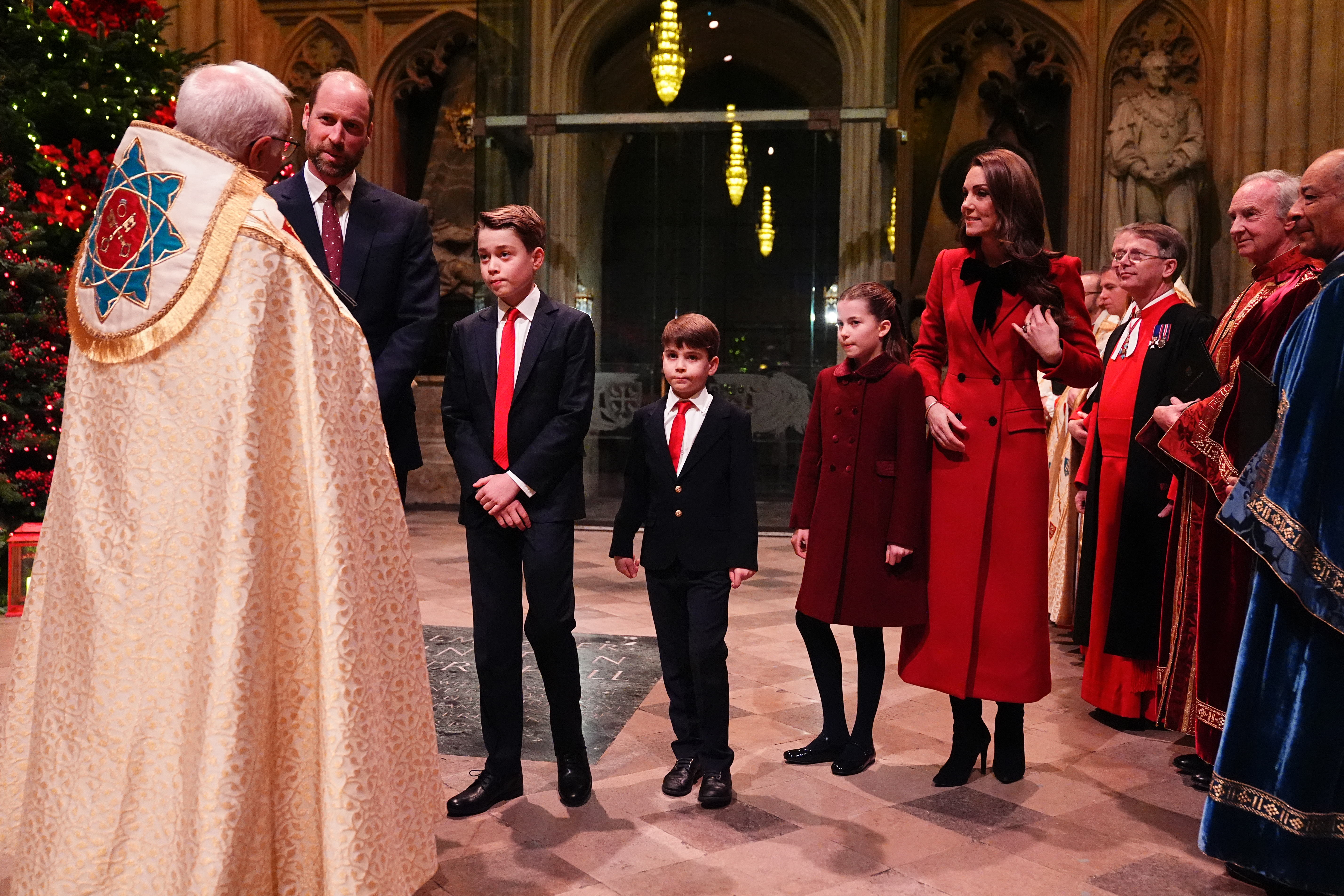 Catherine, wearing a festive red coat featuring a large black bow, mingled with some of the guests.