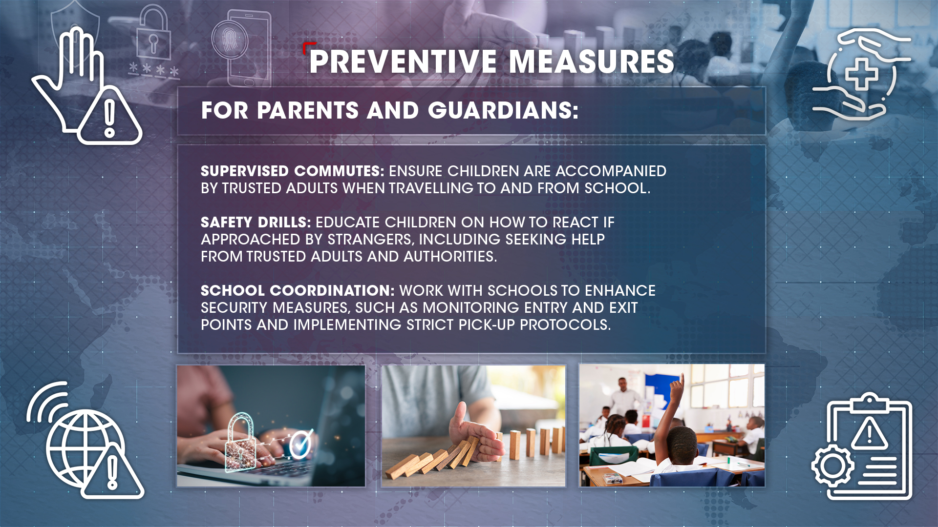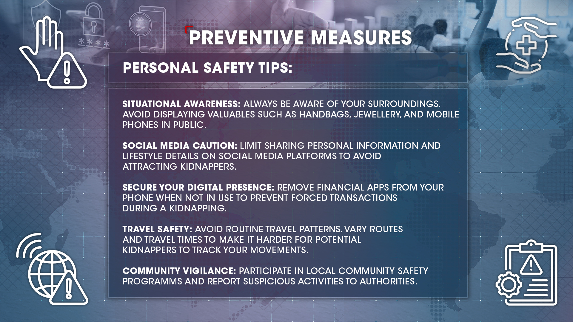 To reduce the risk of becoming a victim of kidnapping, consider the following measures: