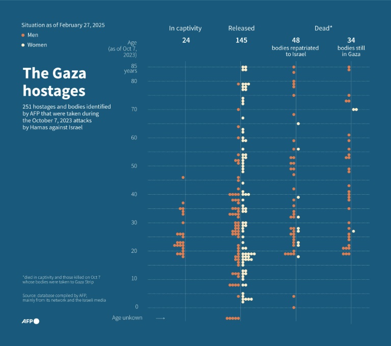 Under the first phase which expires Saturday, Hamas freed 25 living Israeli and dual-national hostages seized in its October 7, 2023 attack and returned the bodies of eight others. It also released five Thai prisoners outside the deal's terms.
