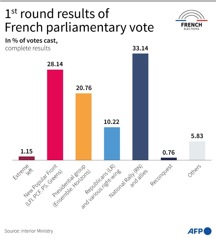 The far-right National Rally (RN) party of Marine Le Pen won a resounding victory in the first round of the polls Sunday, with Macron's centrists trailing in third behind a left-wing coalition.
