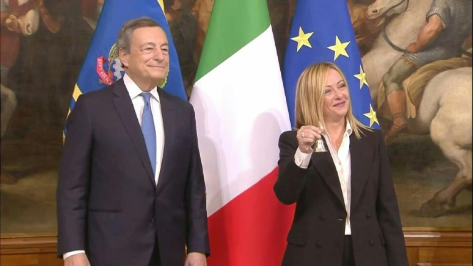 On Sunday Meloni joined outgoing prime minister Draghi, a former European Central Bank chief who took over in February 2021, for a formal handover of power.