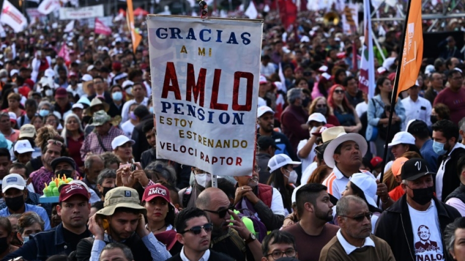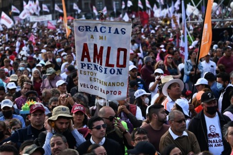 Mexico's popular president Andres Manuel Lopez Obrador rallied more than 100,000 supporters Saturday in Mexico City, attacking the country's right, its "oligarchs" and the United States, just over a year before elections to choose his successor.