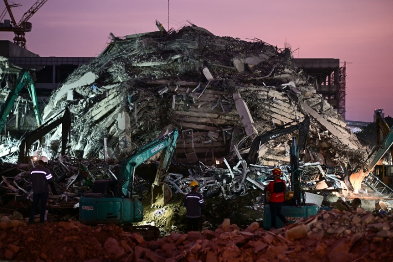 Across the border in Bangkok, rescuers worked through the night searching for survivors trapped when a 30-storey skyscraper under construction collapsed, reduced in seconds to a pile of rubble and twisted metal by the force of the shaking.