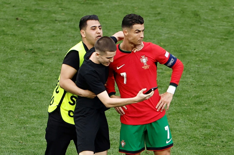 The Group F match in Dortmund, which Portugal won 3-0, was interrupted on several occasions in the second half as pitch invaders got away from security in an attempt to take a photograph with the 39-year-old superstar.