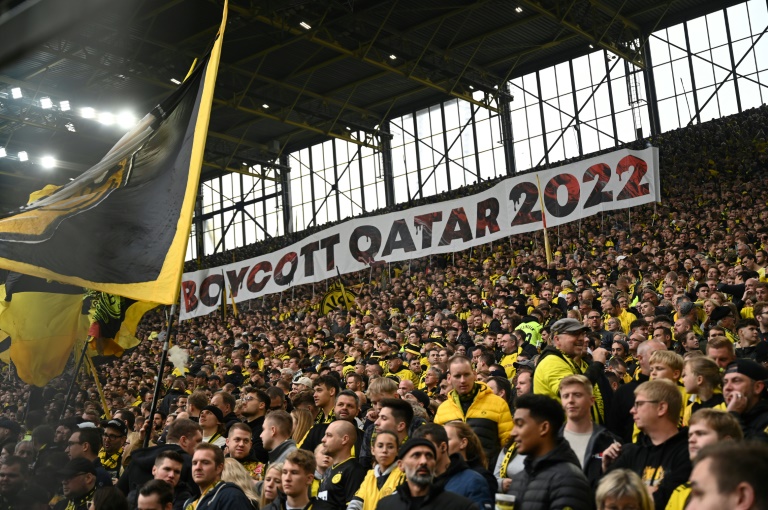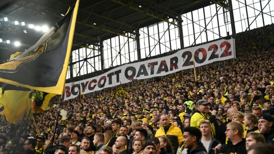 DORTMUND - Fans in Borussia Dortmund's famous 'Yellow Wall' standing section unveilled several banners targeting police brutality as well as the Qatar World Cup on Saturday.