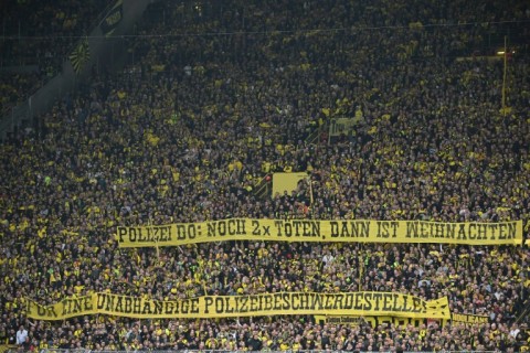 One banner, which German newspaper Der Westen said was unveilled by ultra group 'Desperados', read 'Police Do(rtmund) - killing two more times and then it will be Christmas - For an independent police complaints office'.
