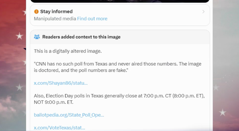 The image, which was posted on social media on the weekend, claimed to show a CNN-branded graphic that put Democratic presidential candidate Kamala Harris well ahead of Donald Trump in Texas, with 10-percent of the vote counted.